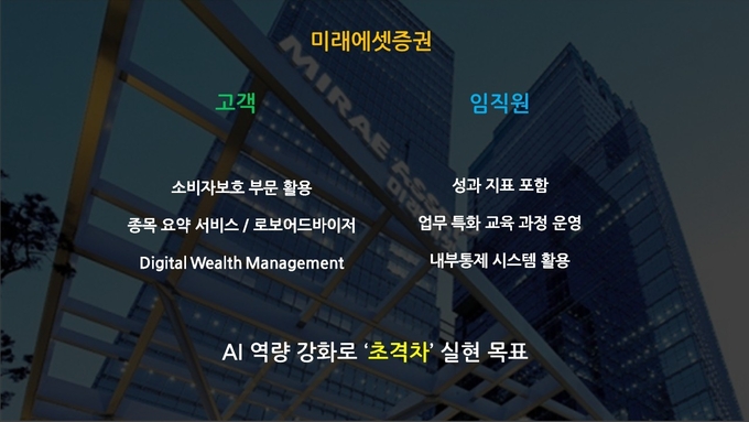 16일 금융투자업계에 따르면 미래에셋증권은 내부적으로 AI 인프라 구축과 활용 확산에 집중하고 있다. 이를 통해 업무 효율과 생산성을 높여 시장에서 ‘초격차’를 만들겠다는 목표다.