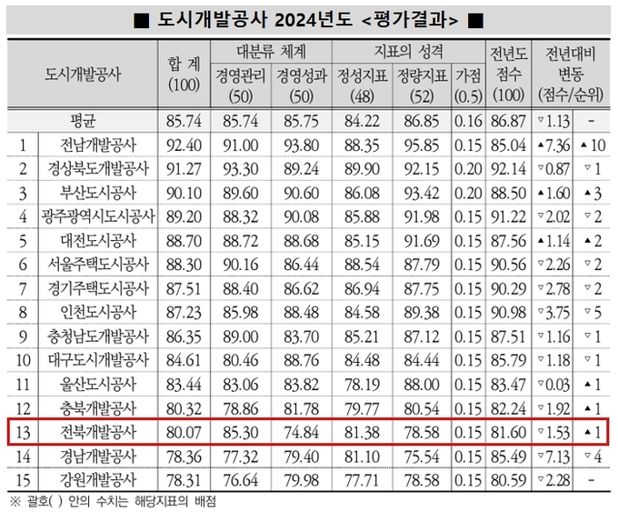 전북개발공사는 전북특별자치도 내 택지 개발과 공공주택 건설, 산업단지 조성 등을 수행하는 대표적인 지역 개발 공기업이다. 지난해 지방공기업 경영평가에서는 최종 점수 80.07점을 기록해 15개 광역개발공사 가운데 종합순위 13위에 머물렀다. 전반적으로 유형 평균보다 낮은 점수를 받았지만 경영관리(85.30점)에 비해 경영성과(74.84점)에서 상대적으로 더 낮은 평가를 받았다.