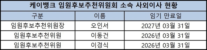 지배구조내부규범 등을 통해 케이뱅크는 사외이사가 연속해 6년 이상 재임할 수 없도록 정하고 있다. 사외이사 중 가장 긴 임기를 보내고 있는 여상훈·신리차드빅스 사외이사의 임기는 2021년 7월 시작했다. 임기 만료 시점은 오는 3월 정기주주총회까지다.
