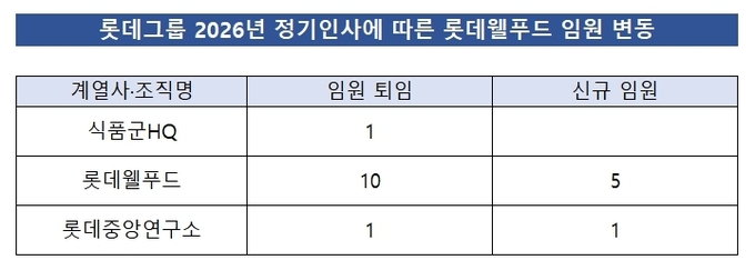 [FETV=김선호 기자] 롯데그룹의 2026년 정기인사로 주요 계열사 롯데웰푸드에서 퇴임한 임원이 12명에 달하는 것으로 확인됐다. 반면 신규 임원 승진자가 6명에 그쳐 전체 규모가 줄어든 형태가 됐다. 특히 글로벌전략부문장과 재무전략부문장 등이 교체된 것이 눈에 띈다.