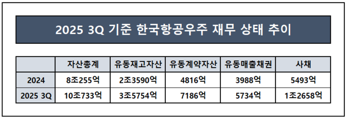 이 같은 자금 목적 변화는 최근 한국항공우주 재무 흐름을 통해 살펴볼 수 있다. 2025년 3분기 말 기준 한국항공우주의 자산총계는 약 10조734억원으로 2024년 말 대비 약 2조원 증가했다.