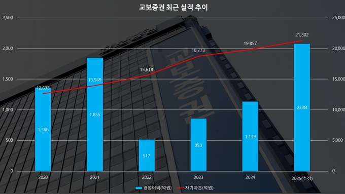 이번 반등은 전년도 실적 부진에 따른 기저효과보다는 시장 환경과 영업 실적 개선이 복합적으로 작용한 결과로 풀이된다. 교보증권의 영업이익은 2020년 1366억원, 2021년 1855억원, 2022년 517억원, 2023년 858억원 수준이었다. 2024년부터 회복 국면에 들어선 가운데 공시대로 실적이 확정되면 지난해 실적은 역대 최고 수준이 된다.
