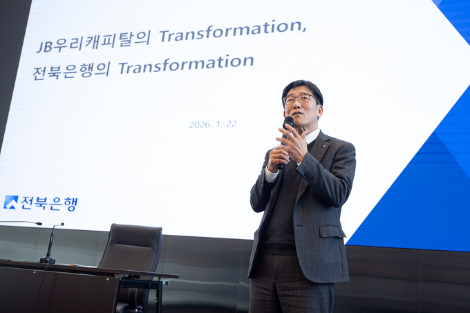 [FETV=임종현 기자] 박춘원 전북은행장이 최근 임직원들과 직접 만나 직원과의 소통의 시간을 갖고 향후 방향과 직원 개개인의 성장에 대한 생각을 공유했다고 23일 밝혔다. 이 자리에서 박 은행장은 JB우리캐피탈 대표 시절 경영 성과 및 조직운영 방안 등과 자신의 삶을 돌아보며 취임 후 직원들과 첫 만남의 시간을 가졌다.