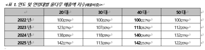 이 같은 흐름은 뷰티·패션·생활소비를 넘어 건강·자기관리 영역으로도 확산되고 있는 것도 확인됐다. 2025년 발생된 러닝 관련 소비를 2024년을 기준(100)으로 비교 분석한 결과 40대의 매출 지수는 162를 기록해 20대와 30대를 웃도는 성장세를 보였다.