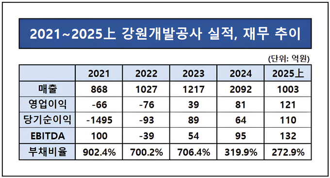 구체적으로 강원특별자치도는 2022년부터 2024년까지 약 1345억원 규모의 현물 출자를 단행했다. 이러한 자본 확충을 거듭한 결과 강원개발공사의 부채비율은 2024년 말 기준 319.9%, 2025년 상반기에는 272.9%로 추가 하락 하는 등 안정 추세에 접어들었다.