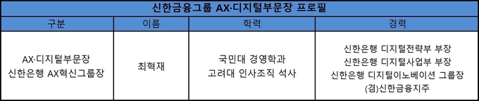 핵심 계열사인 신한은행도 지주 AX·디지털부문 신설 시점에 발맞춰 AX혁신그룹을 새롭게 조직했다. 신한금융의 AX·디지털부문과 신한은행의 AX혁신그룹은 최혁재 부행장이 동시에 지휘하고 있다. 최 부행장은 신한은행에서 디지털마케팅부Tribe Leader, 디지털전략부 부장, 디지털사업부 부장 등 디지털 부문에 오랜 기간 몸담았던 인물이다. AX혁신그룹장으로 이동하기 전에는 디지털이노베이션 그룹장을 역임했다.
