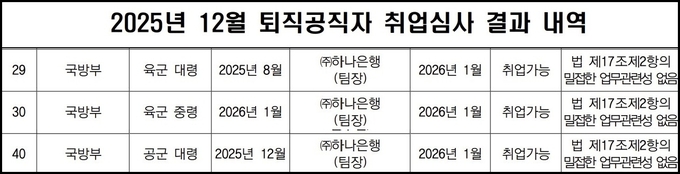 ◇지난해 12월 국방부 소속 16명 퇴직공직자 취업심사 요청