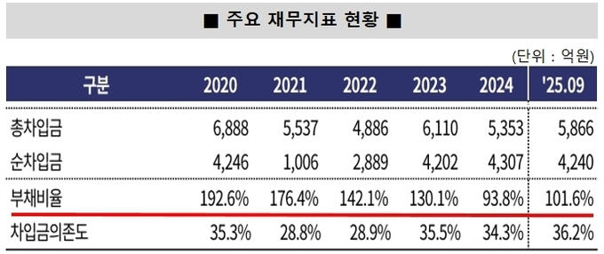 다만 선수금 소진에 따른 부채 축소, 순이익 창출에 따른 자본 확충이 병행되면서 재무 지표는 비교적 안정적인 수준을 유지하고 있다. 2025년 9월 말 기준 부채비율은 약 101%, 차입금의존도는 36%대로 관리되고 있으며 단기성 차입금 1004억원에 비해 현금성 자산이 1600억원을 웃돌아 단기 유동성 부담은 크지 않다는 분석이다.