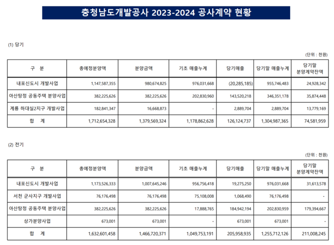 결산보고서 재무 주석 19번에 따르면 내포신도시 분양사업의 총예정분양액, 즉 사업을 모두 마쳤을 때 벌어들일 것으로 예상한 전체 금액이 전년 대비 감소했다. 2023년 기준으로는 내포신도시 분양을 통해 약 1조1735억원의 수익을 올릴 수 있을 것으로 전망됐지만 2024년에는 이를 재산정한 결과 예상 수익 규모가 약 1조1475억원으로 낮아졌다. 이에 따라 사업 전체의 목표 수익 규모가 약 260억원가량 축소됐다.