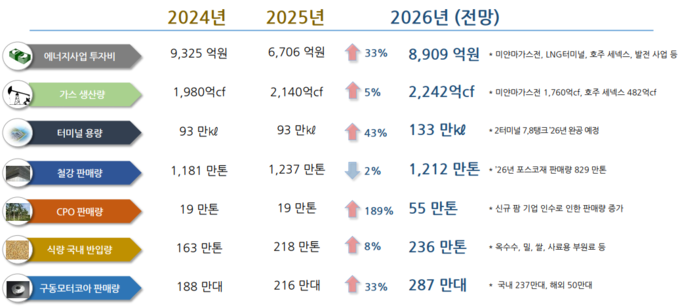 포스코인터내셔널은 2026년 주요 전망 지표를 통해 핵심 사업의 밸류체인 확장 목표를 제시했다. 에너지 분야에서는 미얀마 가스전(1760억cf)과 호주 세넥스(482억cf)를 합산해 총 2242억cf의 가스 생산을 목표로 하고 있다. 또한 광양 제2 LNG 터미널의 7, 8호 탱크를 완공하여 전체 터미널 용량을 133만㎘까지 확대할 예정이다.