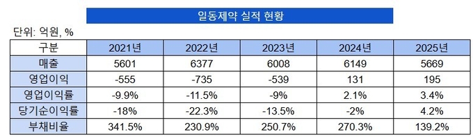 최근 공시된 영업실적(잠정)에 따르면 일동제약의 2025년 연결기준 매출액은 약 5669억원으로 전년(6149억) 대비 7.8% 감소했다. 반면 영업이익은 약 194억원을 기록하며 전년(131억원) 대비 48.5% 증가했다. 순이익은 237억원을 기록하며 7년 만에 흑자로 전환했다.