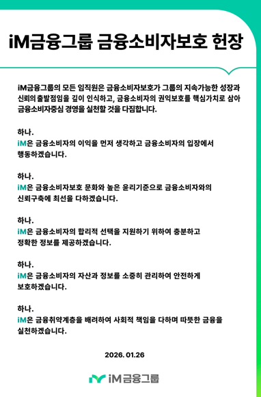 이를 뒷받침하기 위해 iM금융은 최근 조직개편을 단행해 금융소비자보호 전담 조직을 신설하고 그룹 차원의 대응 체계를 정비했다. 그룹 소비자보호총괄책임자(CCO) 산하에 금융소비자보호부를 두고 관련 기능을 전담하도록 했다. 그룹은 전담 조직을 중심으로 소비자보호 거버넌스를 일원화하고 상품 기획부터 판매·사후 관리까지 전 과정에 보호 요소를 반영하는 관리·모니터링 체계를 고도화할 계획이다.