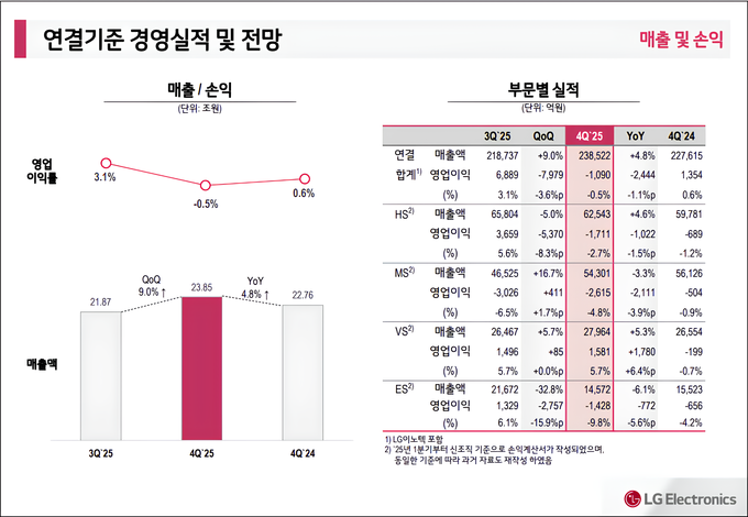 전사 매출액은 2년 연속 최대치를 경신했다. 생활가전과 전장이 각각 관세 부담, 전기차 캐즘 등 비우호적 환경에도 성장하며 전사 최대 매출액 달성에 기여했다. 생활가전과 전장은 2015년 이후 10년 연속 성장세를 이어갔다. 2024년 대비로 보면 매출의 경우 1.7% 증가했지만 영업이익의 경우 27.5% 감소했다.