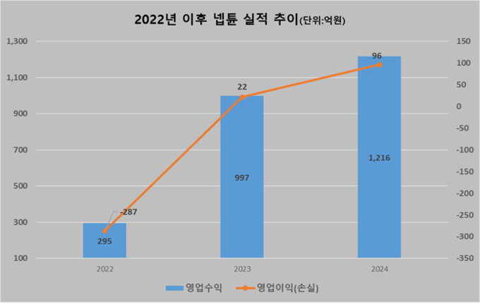 2022년까지 287억원의 영업손실을 기록하며 연속 적자를 이어갔던 넵튠은 2023년 22억원의 영업이익을 내며 상장 7년 만에 첫 영업흑자를 기록했다. 이후 2024년에는 영업이익이 96억원으로 전년 대비 약 336% 증가하며 더 큰 성장세를 보였다.