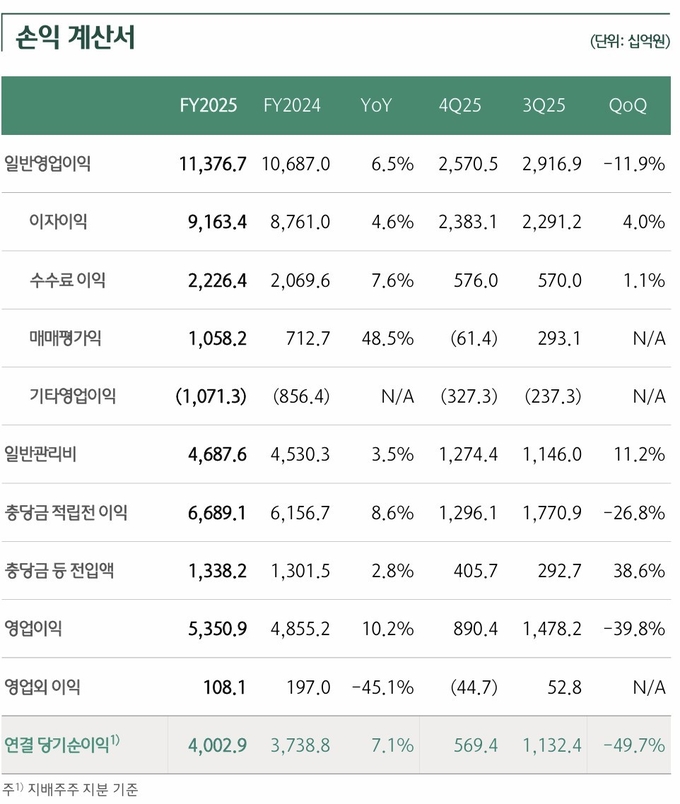 특히, 그룹은 환율 상승에 따른 FX 환산손실 발생 등 대내외 불확실성 확대에도 비이자이익이 전년 동기 대비 14.9% 증가하는 등 시장 변동성에 대한 탄력적 대응과 수익 구조 다각화를 통해 연간 4조원대 당기순이익 실현 기반을 마련했다.