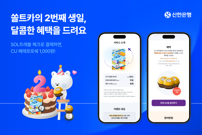 [FETV=권현원 기자] 신한은행이 2월 1일부터 13일까지 SOL트래블 체크카드 출시 2주년을 맞아 CU편의점과 함께 고객 감사 이벤트를 진행한다.