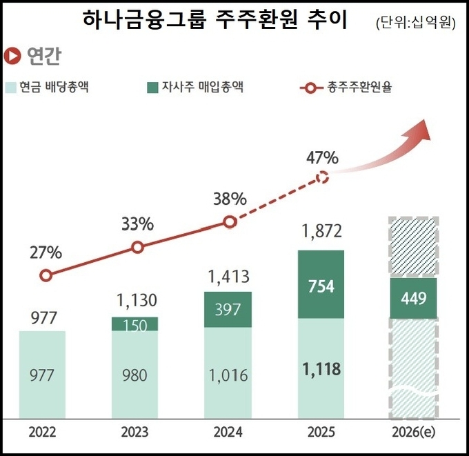 연간 주주환원율 역시 전년 대비 9%p 상승한 46.8%를 기록하며 밸류업 계획에서 목표로 한 2027년까지 50% 달성도 가시권에 들어왔다. 하나금융은 기업가치 제고 계획의 이행을 위해 올해 상반기 총 4000억원 규모의 자사주 매입·소각 계획도 내놨다. 자사주 매입·소각은 1분기와 2분기 각각 2000억원씩 진행한다는 계획이다.