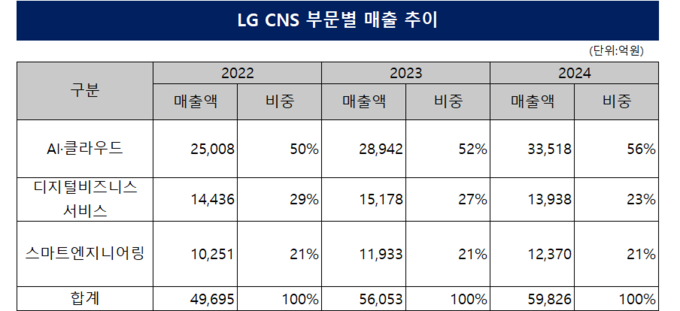 이러한 사업 구조 전환은 실적으로 이어졌다. 2024년까지 LG CNS의 매출규모는 연이어 증가하며 최대 매출 기록을 연이어 갱신했다. 특히 AI·클라우드 부문의 매출과 비중이 꾸준히 증가하며 현신균 대표의 AX 기업으로의 전환은 순조롭게 이뤄졌다.