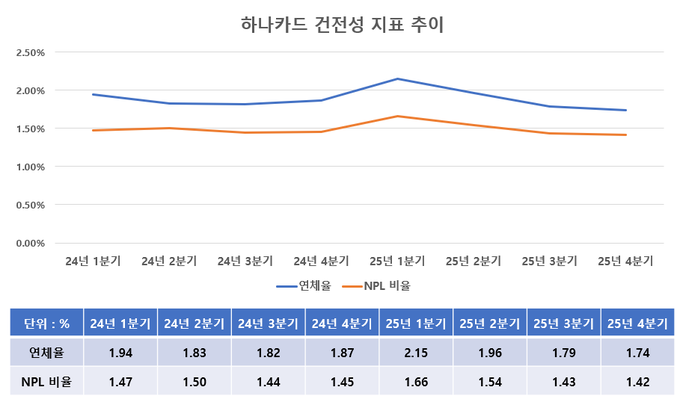 하나카드의 건전성 지표는 전반적으로 개선 흐름을 보였다. 2025년 말 기준 연체율과 고정이하여신(NPL) 비율은 각각 1.74%, 1.42%로 2024년 말 대비 0.13%p, 0.03%p 낮아졌다. 2025년 1분기와 비교하면 연체율과 NPL비율은 각각 0.41%p, 0.24%p 하락해 개선 폭이 더욱 뚜렷하다.