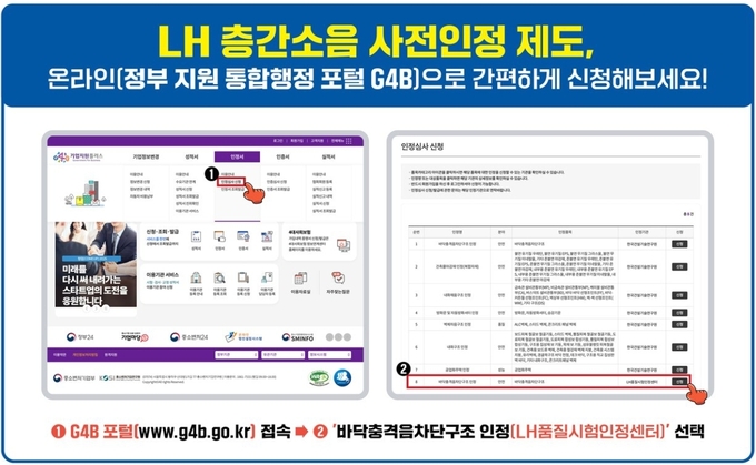 사전인정 신청은 G4B 포털에 접속해 '바닥충격음차단구조 인정(LH품질시험인정센터)'를 선택해 신청하면 된다. 관련 문의는 LH 품질시험인정센터로 하면 된다.