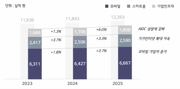 A. 여명희 CFO·CRO 25년 연간 리뷰를 보면 그동안 모바일 성장률이 다소 약세였으나 작년에는 모바일 가입자 기반 확대를 통해 약 4%의 성장을 기록했다. AIDC 중심의 기업 인프라 호조로 전체 외형에서도 가이던스를 초과 달성했다. 전반적인 포트폴리오 재조정과 AX 운영 효율화를 통한 비용 절감 성과도 있었다. 이에 따라 3분기 일시 반영된 구조적 체질 개선 비용을 제외하면 영업이익은 전년 대비 약 20% 증가한 것으로 보인다.