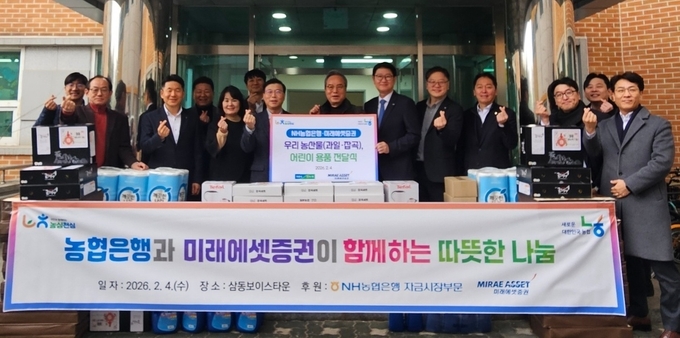 [FETV=권현원 기자] NH농협은행자금시장부문 임직원들은 지난 4일 미래에셋증권 임직원들과 함께 서울시 마포구에 위치한 아동양육시설 '삼동보이스타운'을 찾아 아동들에게 쌀, 과일 등 우리농산물과 어린이 용품을 전달했다고 5일 밝혔다.