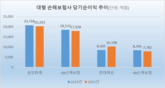 5일 보험업계에 따르면 이날까지 실적을 발표한 삼성화재, DB손해보험, 현대해상, KB손해보험 등 4개 대형 손보사의 연결 재무제표 기준 2025년 당기순이익 합산액은 5조6111억원으로 전년 5조6200억원에 비해 89억원(0.2%) 감소했다.