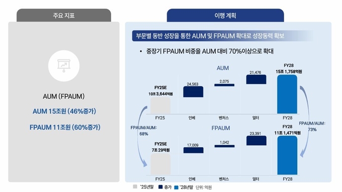 이를 위해 성장성 지표를 개선한다. 스틱인베의 2025년 말 기준 AUM(운용자산)은 10조3644억원, FPAUM(관리보수 창출 AUM)은 7조29억원으로, FPAUM 비중은 약 68% 수준이다. 스틱인베는 2028년까지 AUM을 15조1758억원(46%↑), FPAUM을 11조1471억원(60%↑)으로 확대하고 FPAUM 비중도 73%까지 끌어올려 성장 동력을 강화한다는 계획이다.