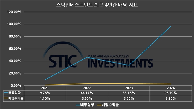 배당에 대한 기대감도 커지고 있다. 스틱인베는 상장 VC 가운데 주당 배당금 규모가 큰 편에 속한다. 실제로 배당성향은 2021년 9.76%에서 2024년 96.79%로 상승했으며, 같은 기간 배당수익률도 1.1%에서 2.9%로 1.8%포인트 올랐다. 같은 기간 배당수익률도 1.1%에서 2.9%로 1.8%포인트 상승했다. 2005년부터 2024년까지 결산배당도 20회 연속 진행하고 있다.