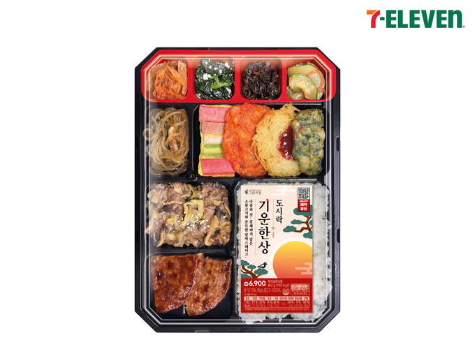 세븐일레븐이 설을 맞아 오는 10일 새롭게 선보이는 명절 도시락은 ‘기운한상도시락(6,900원)’이다. 쫀득한 알떡스테이크와 소불고기, 모둠전을 메인으로 구성하고 가정식 잡채와 각종 나물을 더해 총 11가지 반찬으로 구성했다. 명절 상차림의 핵심 메뉴들을 한 도시락에 담아내 혼자서도 든든하고 풍성한 설 한 끼를 즐길 수 있도록 기획한 것이 특징이다.