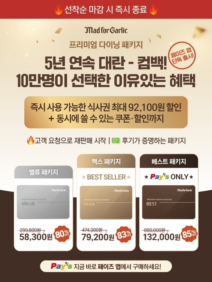 프리미엄 다이닝 패키지는 2월 9일부터 쿠프마케팅이 운영하는 모바일 쿠폰 마켓 페이즈 앱에서 단독 판매되며 한정 수량 소진 시 조기 종료된다. 식사권은 수량 제한 없이 중복 사용 가능하며 쿠폰과 메뉴 할인권도 각각 1회 중복 적용할 수 있다. 식사권 이용 시 추가 주문 금액에 대해서는 통신사·카드사·멤버십 제휴 할인 또는 적립 혜택도 함께 적용돼 실질적인 할인 폭을 더욱 키웠다. 자세한 내용은 매드포갈릭 공식 홈페이지에서 확인할 수 있다.
