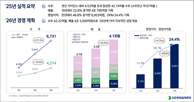 HD현대일렉트릭은 지난해 연결 기준 매출 약 4조1000억원, 영업이익 9953억원을 기록해 전년 대비 각각 22.8%, 48.8% 증가한 실적을 보였다. 북미 시장을 중심으로 전력망 교체 수요와 AI 관련 전력 인프라 투자 확대가 이어지면서 외형 성장과 수익성 개선이 동시에 나타난결과다. 부채비율은 2024년 151.8%에서 2025년 134.6%로 감소했고 순차입금비율 역시 -38.5%를 기록하며 2024년 대비 순현금 기조가 강화되는 등 재무 구조 안정도 이뤄졌다.