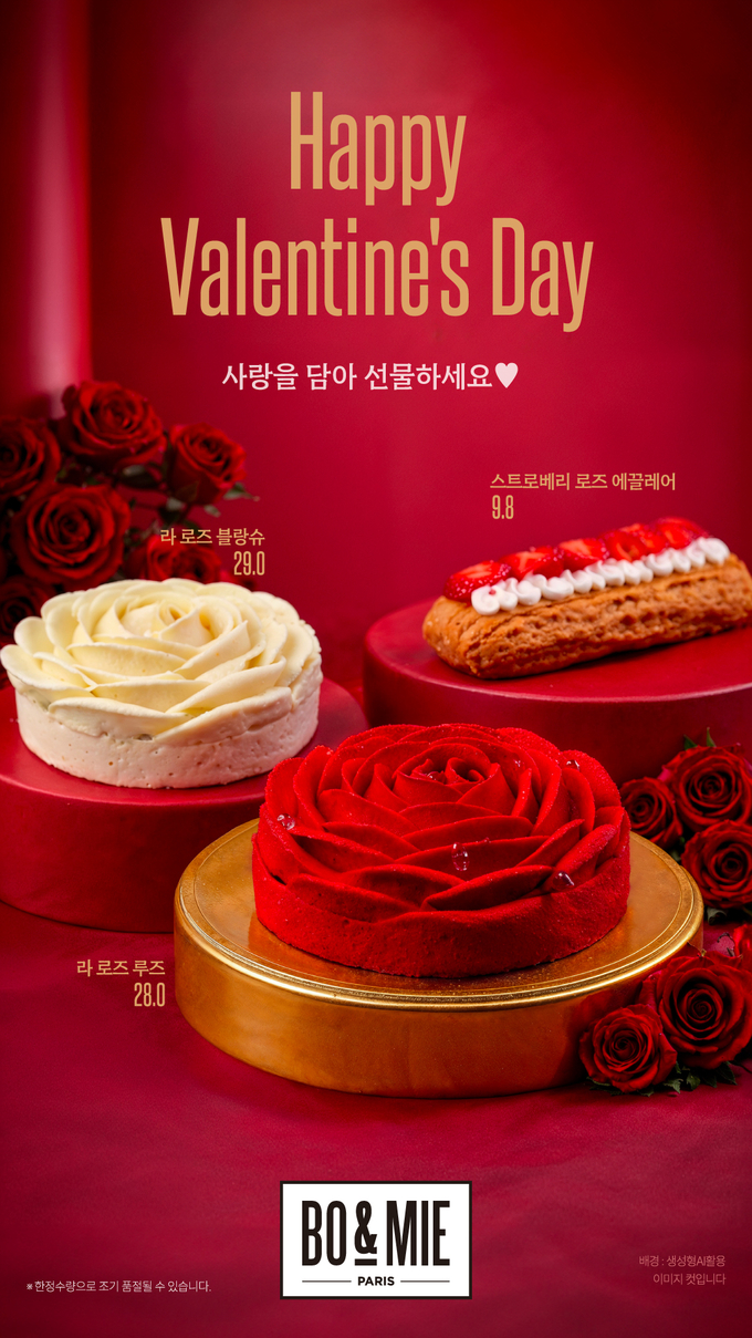 이번 신제품은 3종은 파리의 발렌타인데이를 연상시키는 우아한 색상과 섬세한 디테일로 완성한 프리미엄 케이크 ‘라 로즈’ 2종과 디저트 ‘스트로베리 로즈 에끌레어’다.