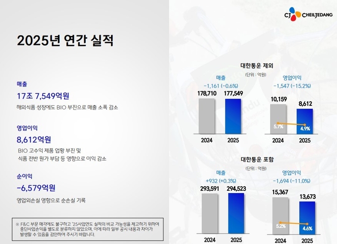 CJ제일제당은 지난해 매출 17조7549억원, 영업이익 8612억원을 기록했다고 9일 밝혔다. 전년 동기 대비 매출은 0.6%, 영업이익은 15.2% 감소했다.