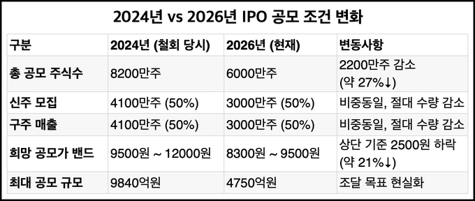 최우형 대표는 “2024년 상장 추진 시 공모가 밴드는 9500~1만2000원이었고, 공모 규모가 8200만주였으므로 2024년 대비 공모 구조를 시장 친화적으로 설계한 것”이라고 설명했다.