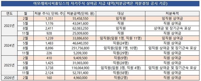 아모레퍼시픽홀딩스가 임직원에게 상여금으로 자기주식을 처분한 공시를 종합해보면 매년 2월, 5월, 8월, 11월에 지급한 것으로 확인됐다. 특히 8월에는 상여금을 포함한 장기근속 포상도 이뤄지기 때문에 자기주식 처분금액이 다른 때에 비해 큰 편이었다.