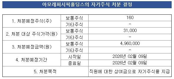 최근 아모레퍼시픽홀딩스는 자기주식 160주를 직원 2명에게 상여금으로 지급하기로 결정했다고 공시했다. 처분 예정금액은 496만원이다. 이에 따라 2월 9일에 예정대로 지급됐고 주가 변동으로 총 처분가액은 487만원으로 조정됐다.