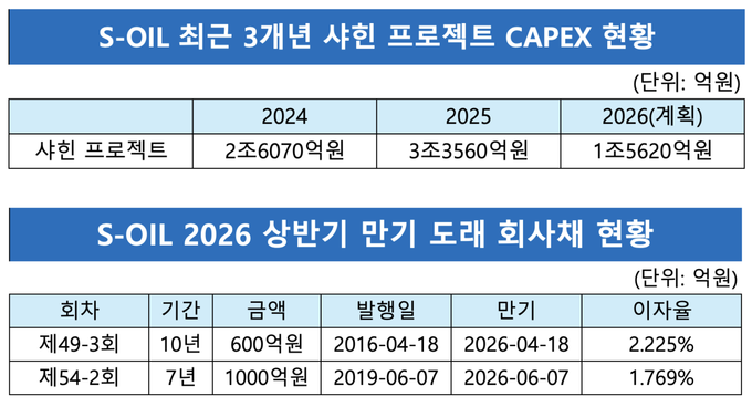 공시에 따르면 S-OIL는 올해 상반기 약 1600억원 규모의 공모채를 상환해야 한다. 올해 상반기 만기가 도래하는 S-OIL의 공모채는 ▲600억원 규모(10년물) ▲1000억원 규모(7년물)로 만기일은 각각 4월 18일, 6월 7일이다. 이번 공모로 조달된 자금 중 일부는 만기가 도래하는 회사채 상환을 위해 쓰일 전망이다.