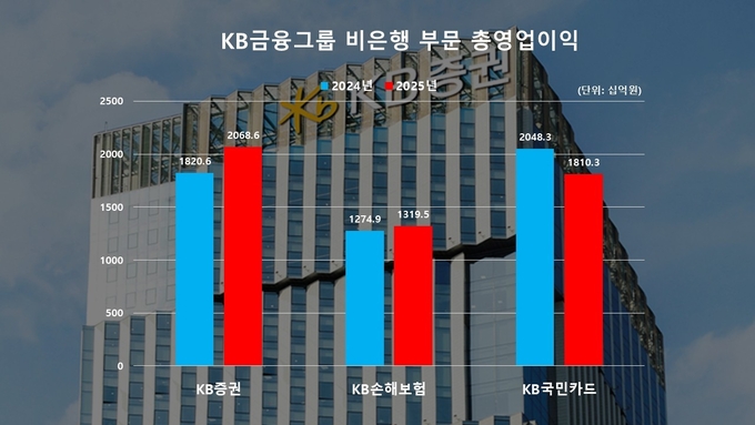 영업이익만 측면에서는 KB손해보험이 여전히 그룹 내 2위 자리를 지키고 있지만 성장세 면에서는 증권에 미치지 못했다. KB손해보험의 영업이익은 2024년 1조1366억원에서 2025년 1조1396억원으로 전년 대비 0.3% 증가에 그쳤다. 반면 강진두 대표가 이끄는 KB증권은 2024년 7733억원에서 지난해 9041억원으로 16.9% 급성장했다.
