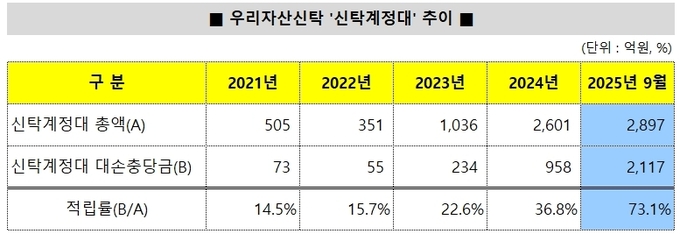 실제 신탁계정대는 2025년 3분기 말 2897억원으로 상반기 말 대비 4.3% 감소했다. 금융지주계열 신탁사 중 감소 전환 사례는 우리자산신탁이 유일하다. 책임준공 확약 사업장이 대부분 준공되면서 구조적 증가 요인이 사라졌다는 분석이다.