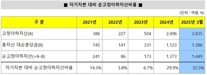 건전성 지표도 2024년을 거치며 악화됐다. 자기자본 대비 순고정이하자산비율은 2023년 말 6.7%에서 2024년 말 29.9%, 2025년에는 32.5%까지 상승했다. 책임준공형 사업의 부실이 자산 건전성 전반에 부담으로 작용한 것이다.