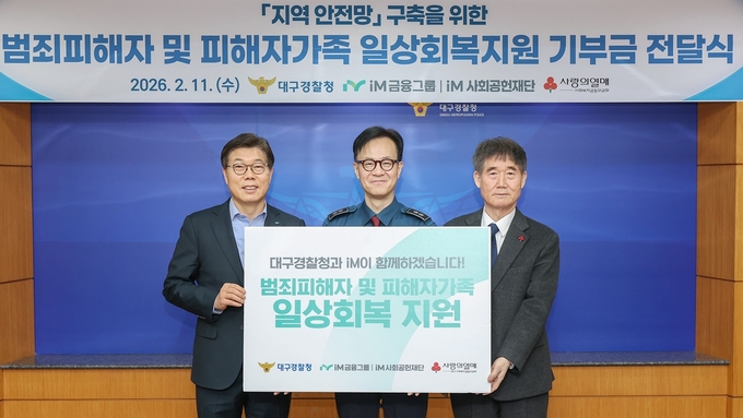 [FETV=임종현 기자] iM금융그룹 iM사회공헌재단은 지난 11일 대구광역시 수성구에 소재한 대구경찰청에서 강력범죄로 고통을 호소하고 있는 취약계층 피해자와 피해자 가족의 일상 회복을 돕고 지역 안전망 구축을 위한 후원금 전달식을 진행했다고 12일 밝혔다.