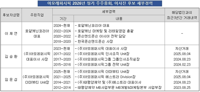 이 가운데 아모레퍼시픽은 이번 주총에 이재연 사외이사 선임, 김승환 사내이사, 임운섭 사내이사 선임의 건을 상정했다. 사내이사로 보면 김승환 아모레퍼시픽 대표 사장은 재선임, 임운섭 더마뷰티유닛장은 신규 선임되는 건이다.