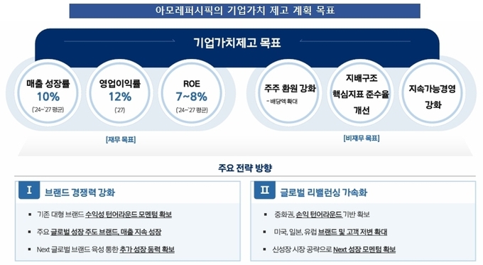 특히 아모레퍼시픽은 2024년 11월 발표한 기업가치 제고 계획에서 2024년부터 2027년까지 연평균 매출 성장률 10%, 2027년 영업이익률 12%, 2024년부터 2027년까지 평균 ROE 7~8% 달성 목표를 제시했다.