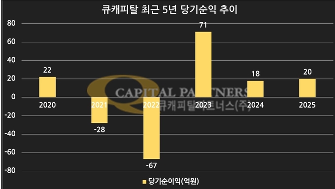 전년 대비 반등에는 성공했지만, 최근 큐캐피탈의 실적 흐름은 안정적이라고 보기 어렵다. 큐캐피탈은 2020년 당기순이익 22억원을 기록했지만, 2021년과 2022년에는 각각 28억원, 67억원의 당기순손실을 냈다. 이후 2023년 71억원, 2024년 18억원의 당기순이익을 거두며 다시 흑자로 돌아섰다.