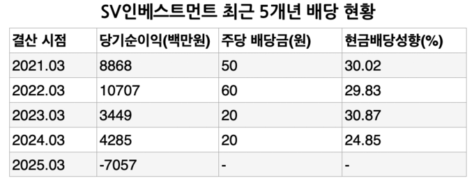 하지만 2025년 결산에서 실적이 악화되면서 무배당을 결정한 것으로 풀이된다. SV인베는 지난 2025년 3월 결산에서 70억5700만원의 당기순손실로 나타났다. 과거 24억원 규모의 적자를 기록했던 때도 배당을 진행했지만 이번 손실 규모는 현금배당을 진행하기에 부담스러운 수준이었던 것으로 분석된다.