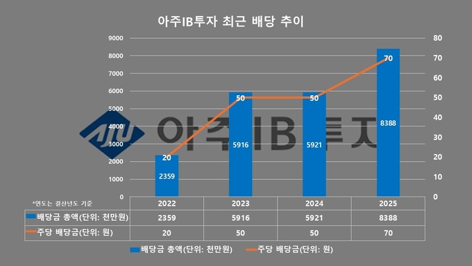 금융감독원 전자공시시스템에 따르면, 아주IB투자는 지난달 12일 이사회 결의를 통해 현금배당을 결정했다. 주당 70원 수준으로, 배당금 총액은 약 83억9000만원 규모다. 이번 현금배당안은 오는 3월 27일 열리는 제52기 정기주주총회에 안건으로 상정될 예정이다.