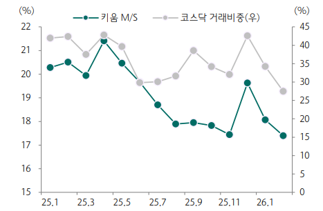 4일 하나증권 리포트에 따르면 키움증권의 국내주식 시장점유율(M/S)은 2025년 1월 20.3%에서 2026년 2월 17.4%로 하락했으나, 향후 코스닥 중심의 개인 매수세가 본격화될 경우 반등 가능성이 높다. 코스닥 거래비중은 2025년 1월 42.0%에서 2026년 2월 27.5%까지 하락한 상태로, 향후 개인의 본격적인 순매수 전환 시 브로커리지 수익 성장이 기대된다고 분석했다.