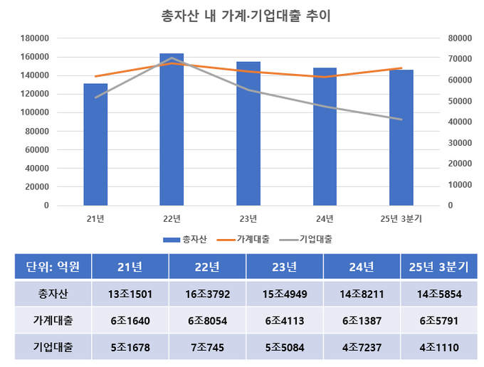 실제로 2022년 말 자산이 확대된 시기를 보면 기업대출 확대가 주요 요인으로 작용했다. 기업자금대출은 7조745억원으로 전체 대출의 50.96%를 차지해 가계대출보다 비중이 컸다. 업계에서는 당시 수준까지 기업자금대출이 확대될 경우 자산 성장 속도도 다시 빨라질 수 있다는 전망이 나온다.