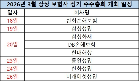 18일 한화손보를 시작으로 19일에는 삼성생명의 주주총회가 열린다.